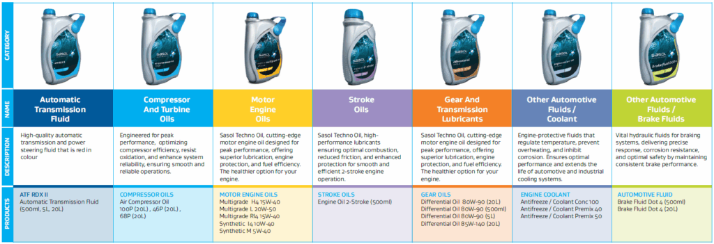Sasol is one of the leading oil companies in South Africa and an expert Engine Oil supplier for multiple applications. Oil Warehouse has entered into a partnership as a distributor of SASOL TECHNO OIL.View our lubricants range below for more information on how we can fit your business needs.